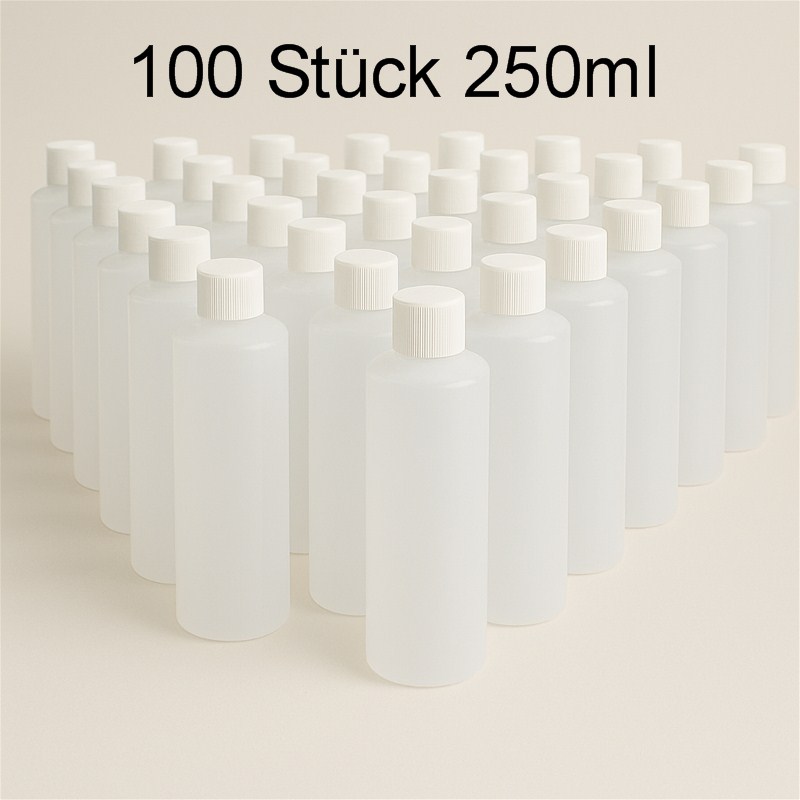 Startseite    »    Zubehör    »    Leerflaschen    »   250 ml Kunststoff-Leerflaschen mit Schraubverschluss – 100 Stück im Vorteilspack